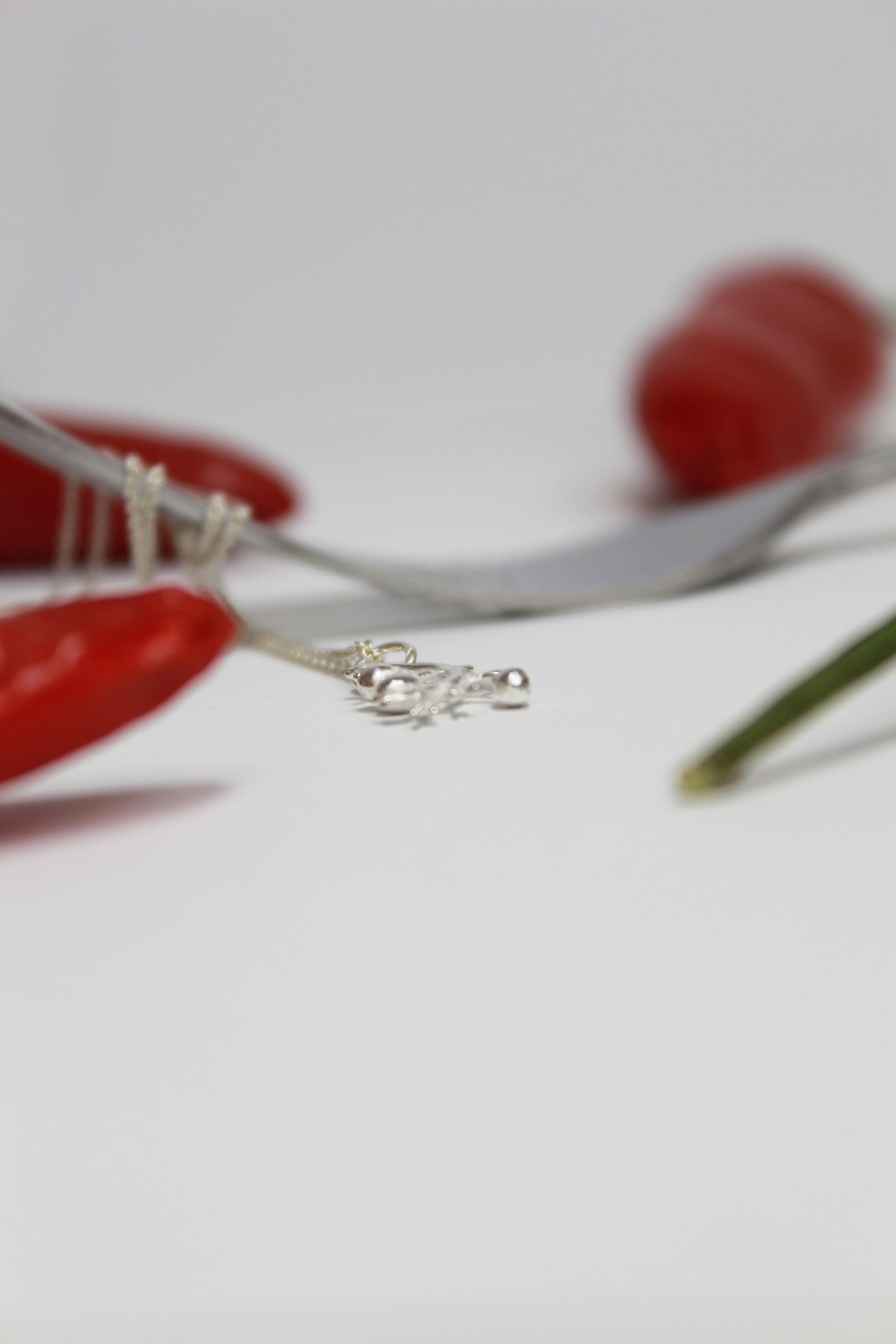 The base of the pendant is in 800 silver and is made by a goldsmith's shop specializing in historical jewels. Every minimal irregularity in polishing or shape is desired and is the result of manual processing.