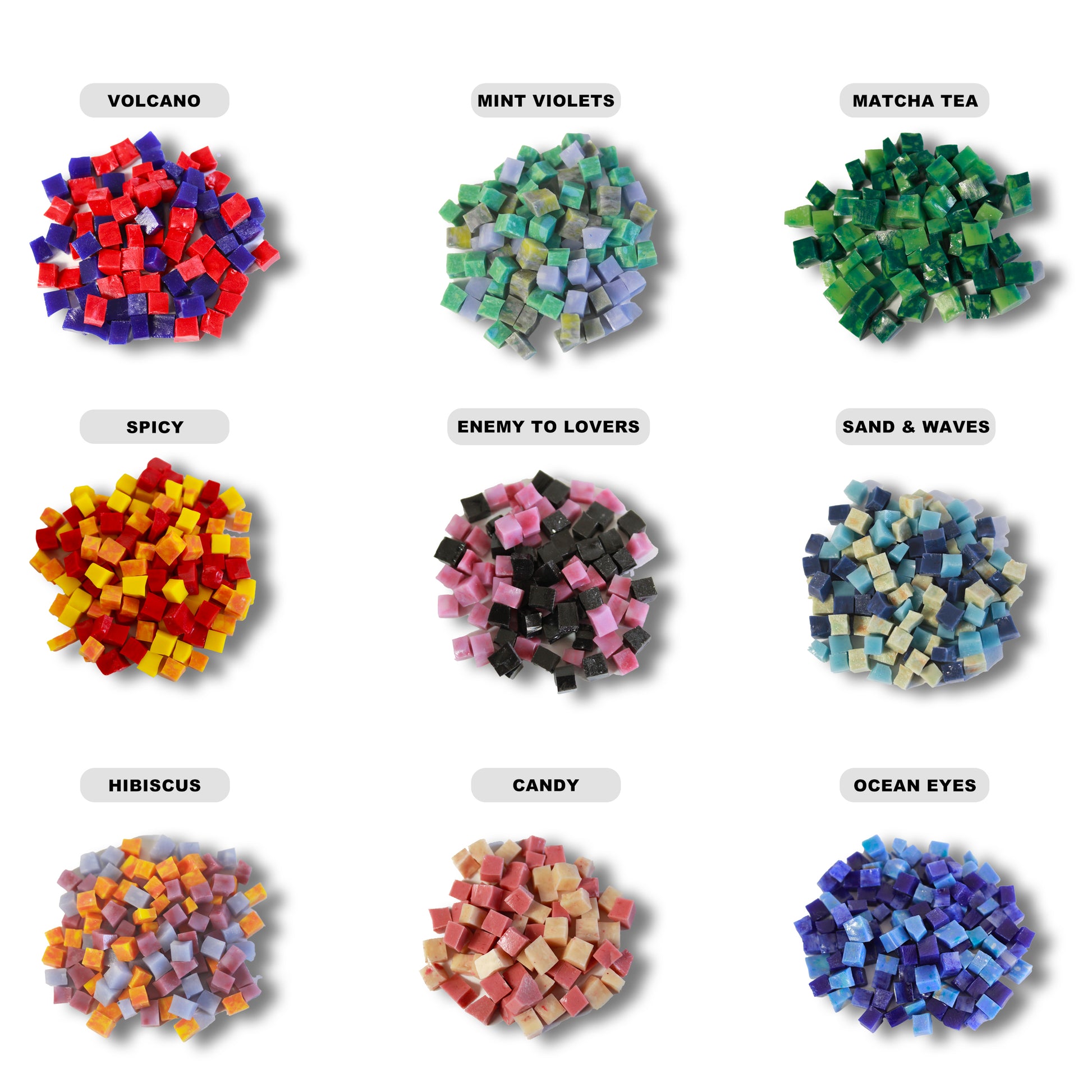 Nelle immagini potrai vedere che abbiamo proposto 9 mix di colori: VOLCANO, MINT VIOLETS, MATCHA TEA, SPICY, ENEMY TO LOVERS, SAND & WAVES, HIBISCUS, CANDY, OCEAN EYES.