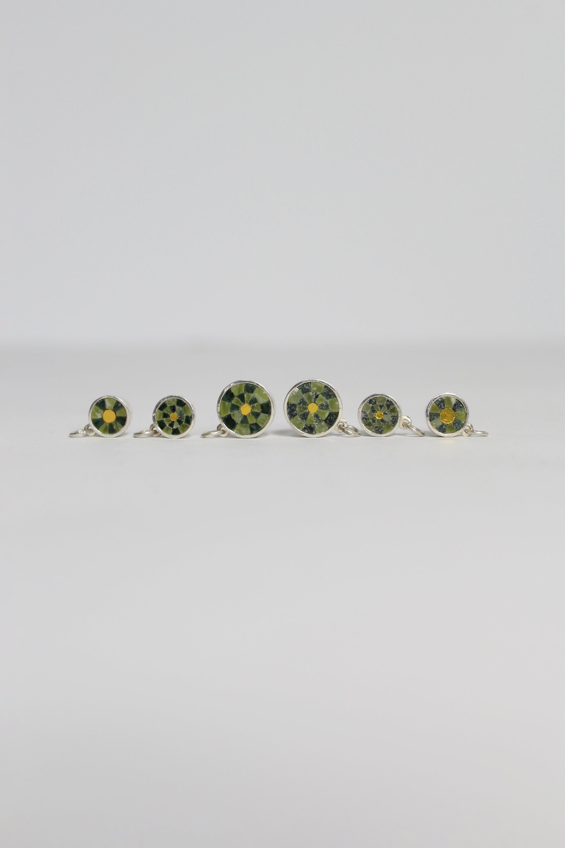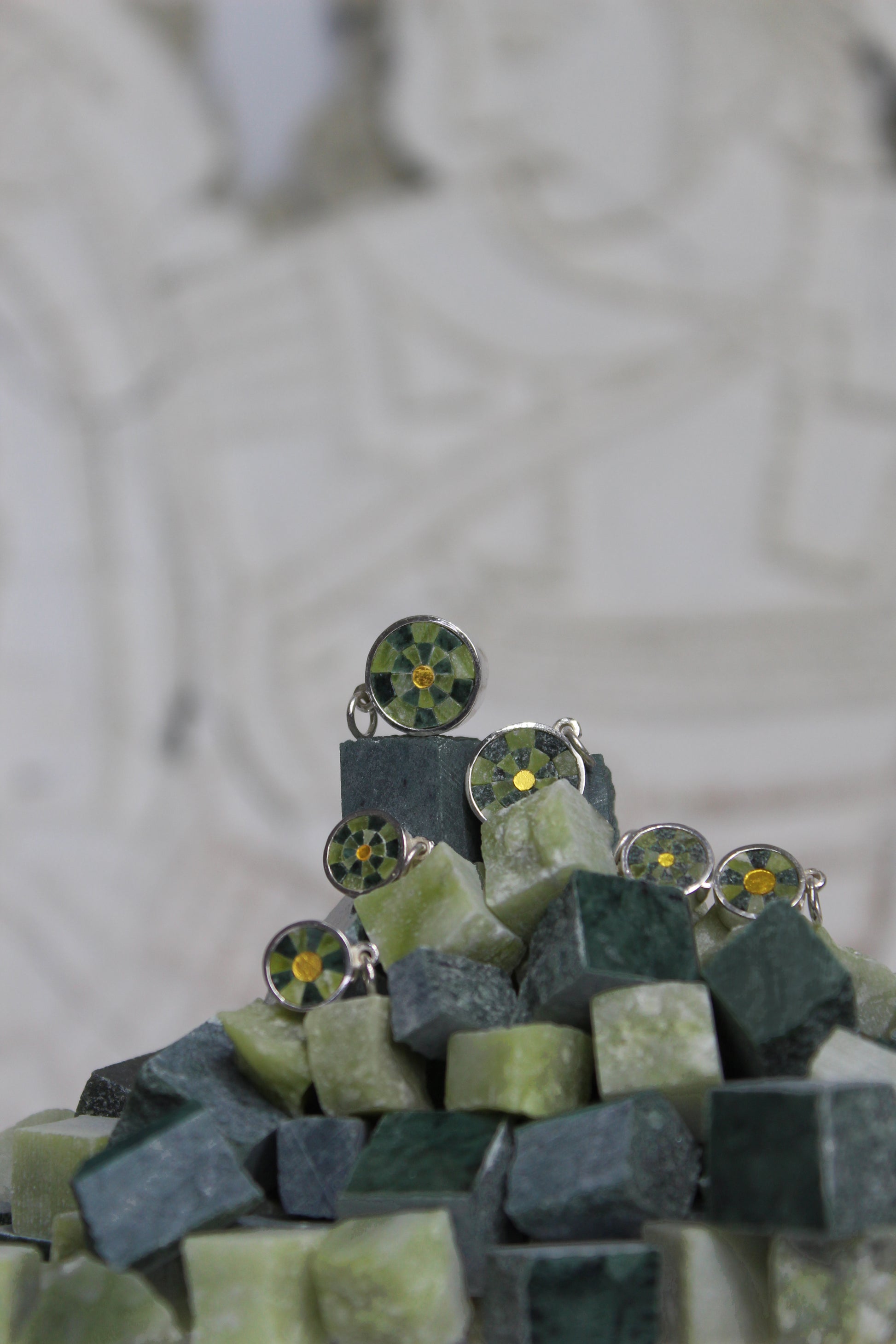 Il ricamo in micromosaico, minuziosamente composto a mano, è realizzato con due tipi di marmo (Verde Ming e Verde Guatemala) e una tessera centrale di vetro a foglia d'oro.