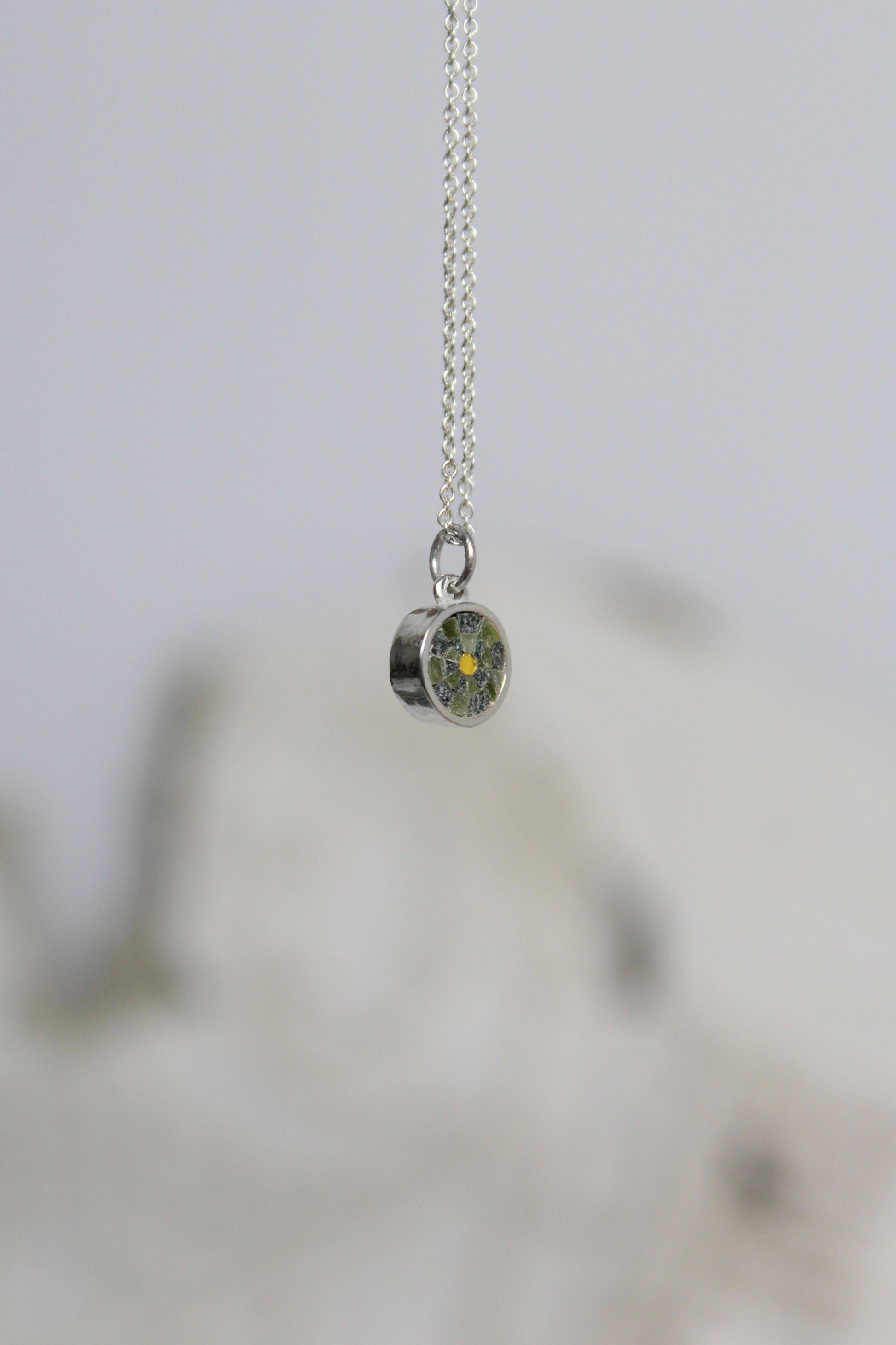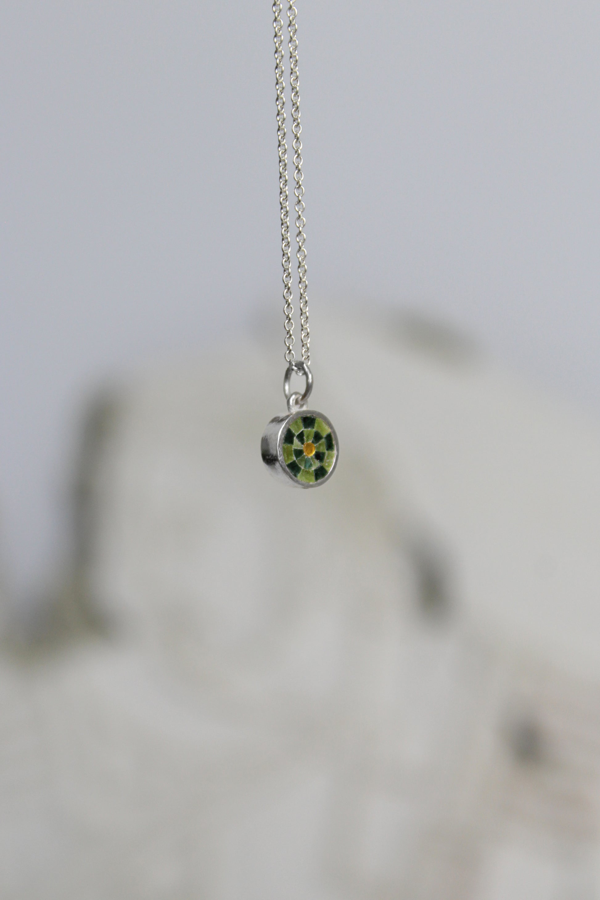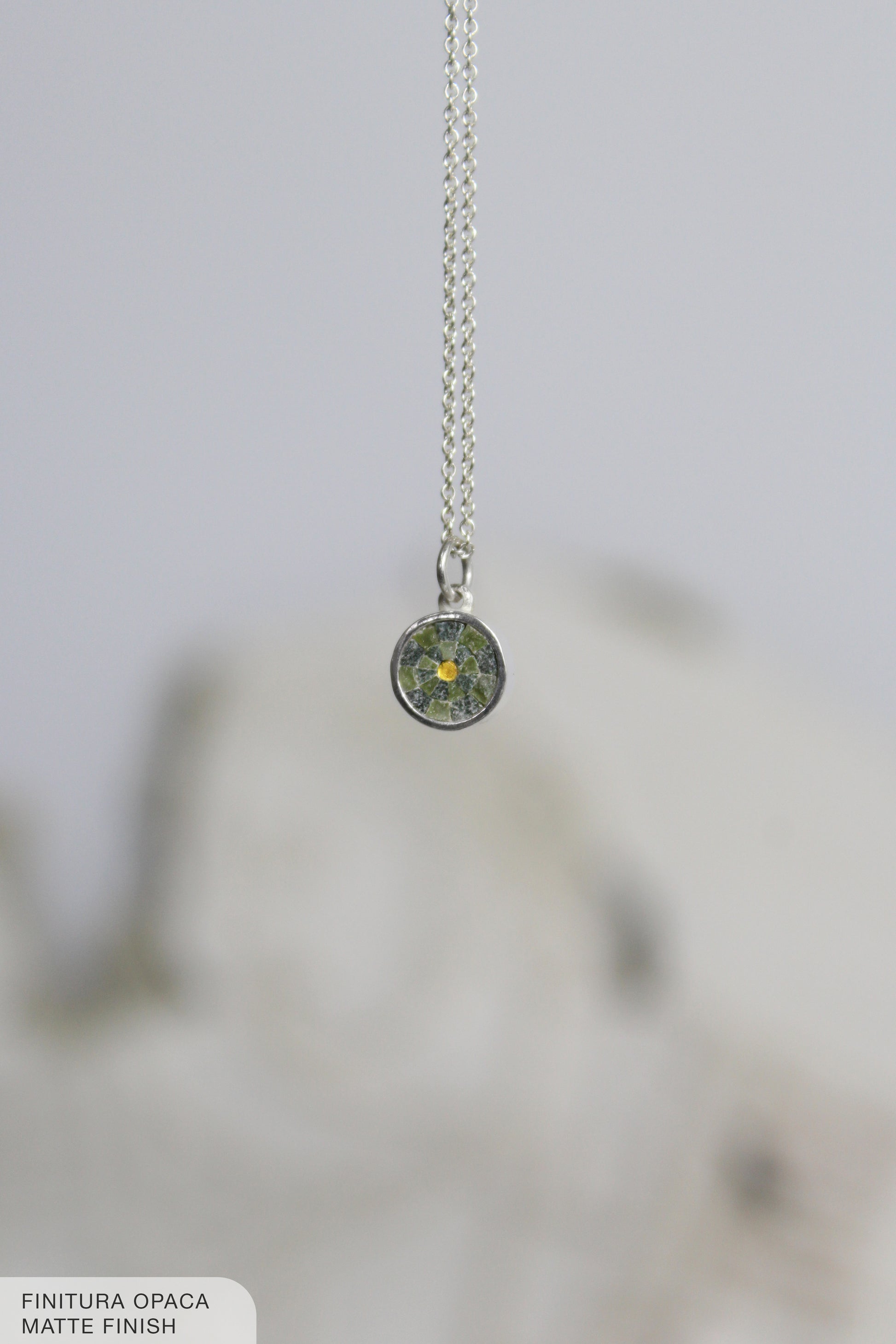 La base del ciondolo è in argento 800 ed è realizzata da una bottega orafa specializzata in gioielli storici. Ogni minima irregolarità di lucidatura o forma è voluta ed è il risultato di una lavorazione manuale.