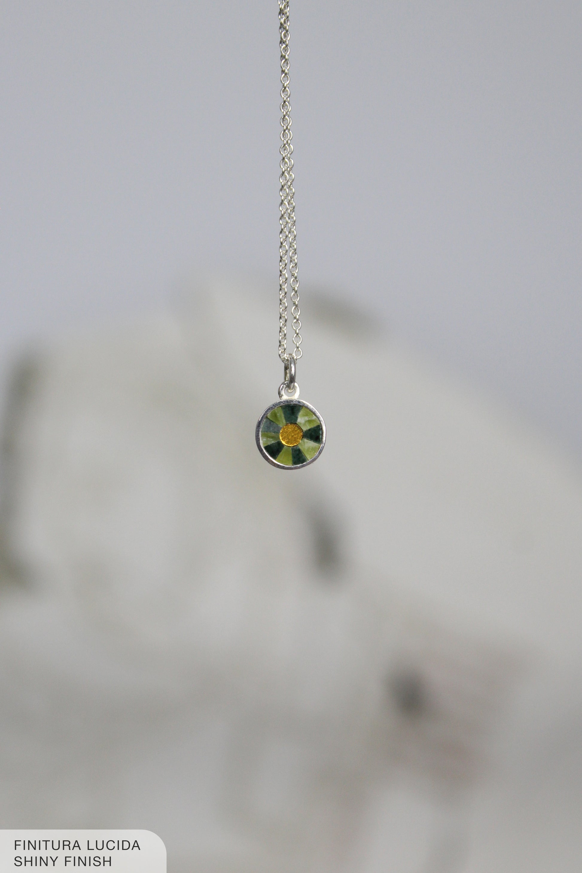 La base del ciondolo è in argento 800 ed è realizzata da una bottega orafa specializzata in gioielli storici. Ogni minima irregolarità di lucidatura o forma è voluta ed è il risultato di una lavorazione manuale.