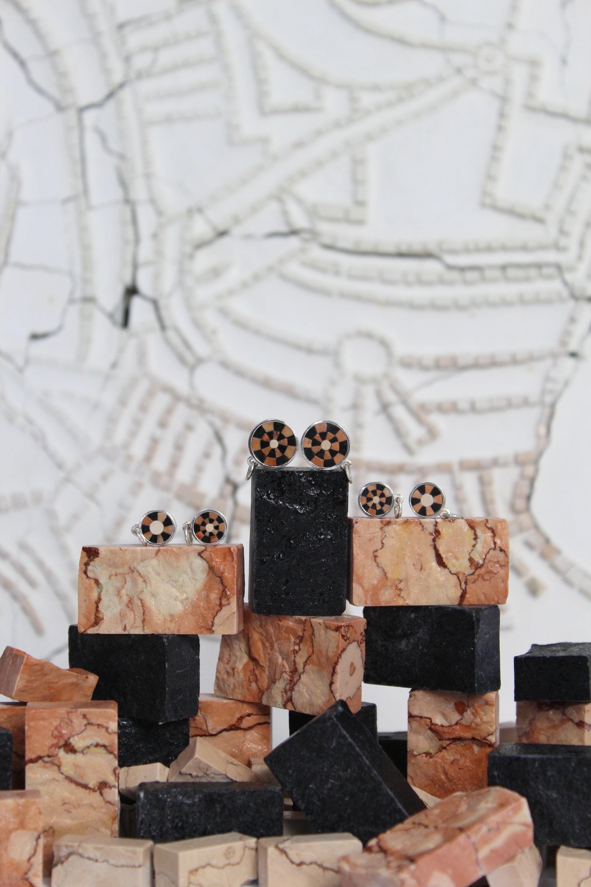 Il ricamo in micromosaico, minuziosamente composto a mano, è realizzato con tre tipi di marmo: Rosa Corallo, Nero Belgio, Perlino Rosato.