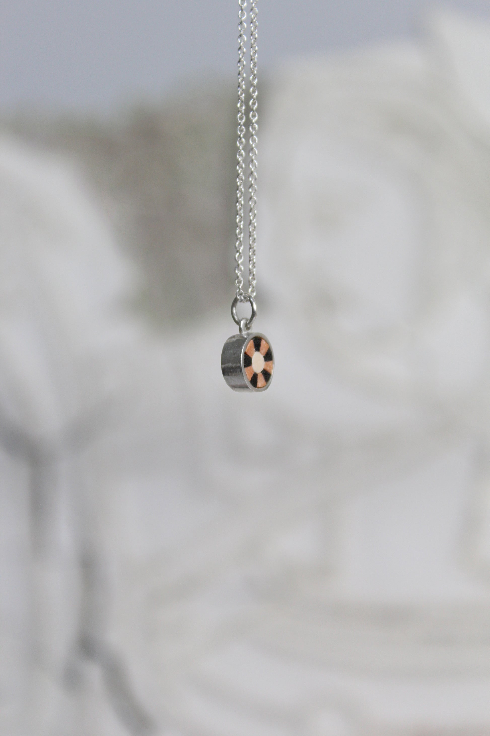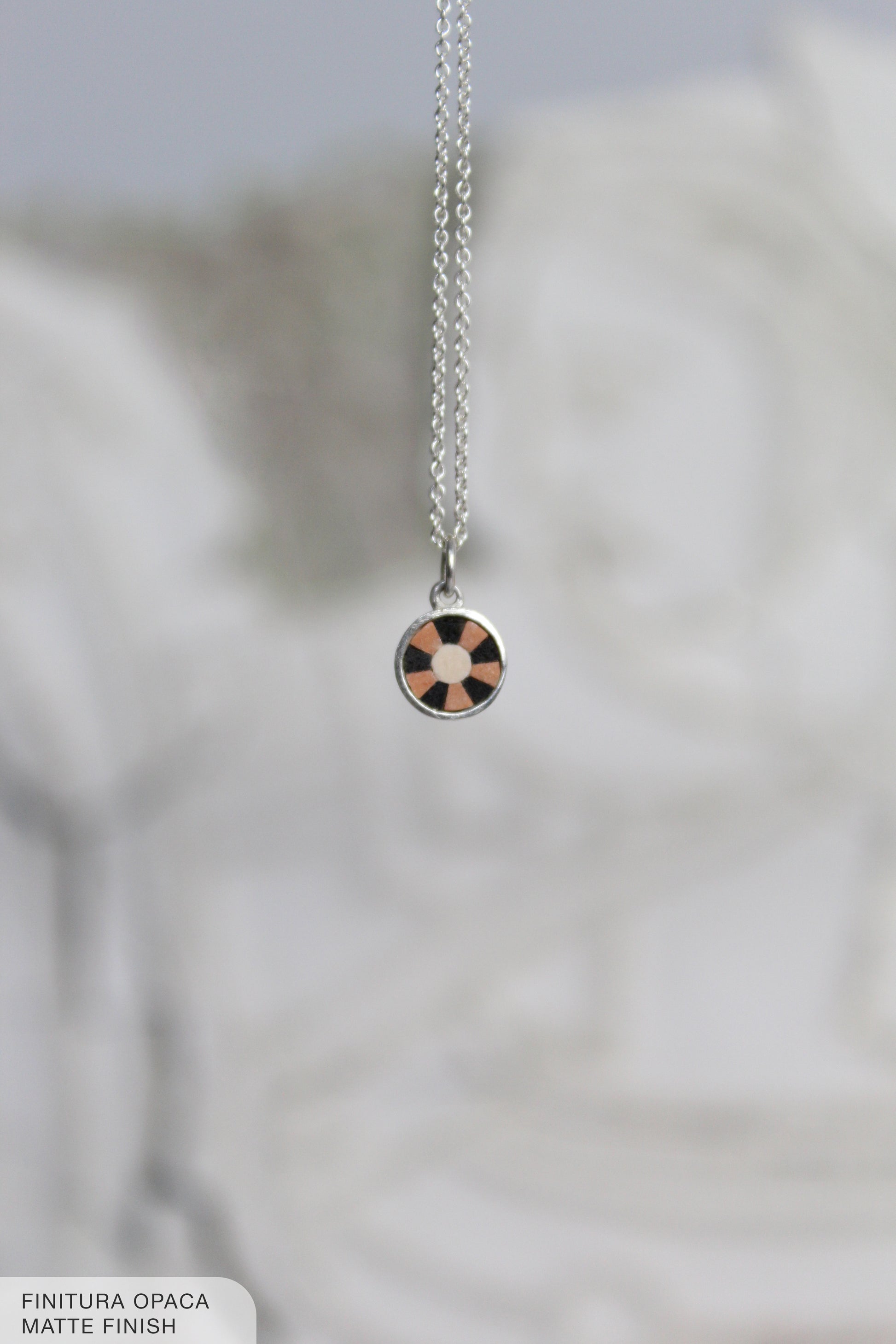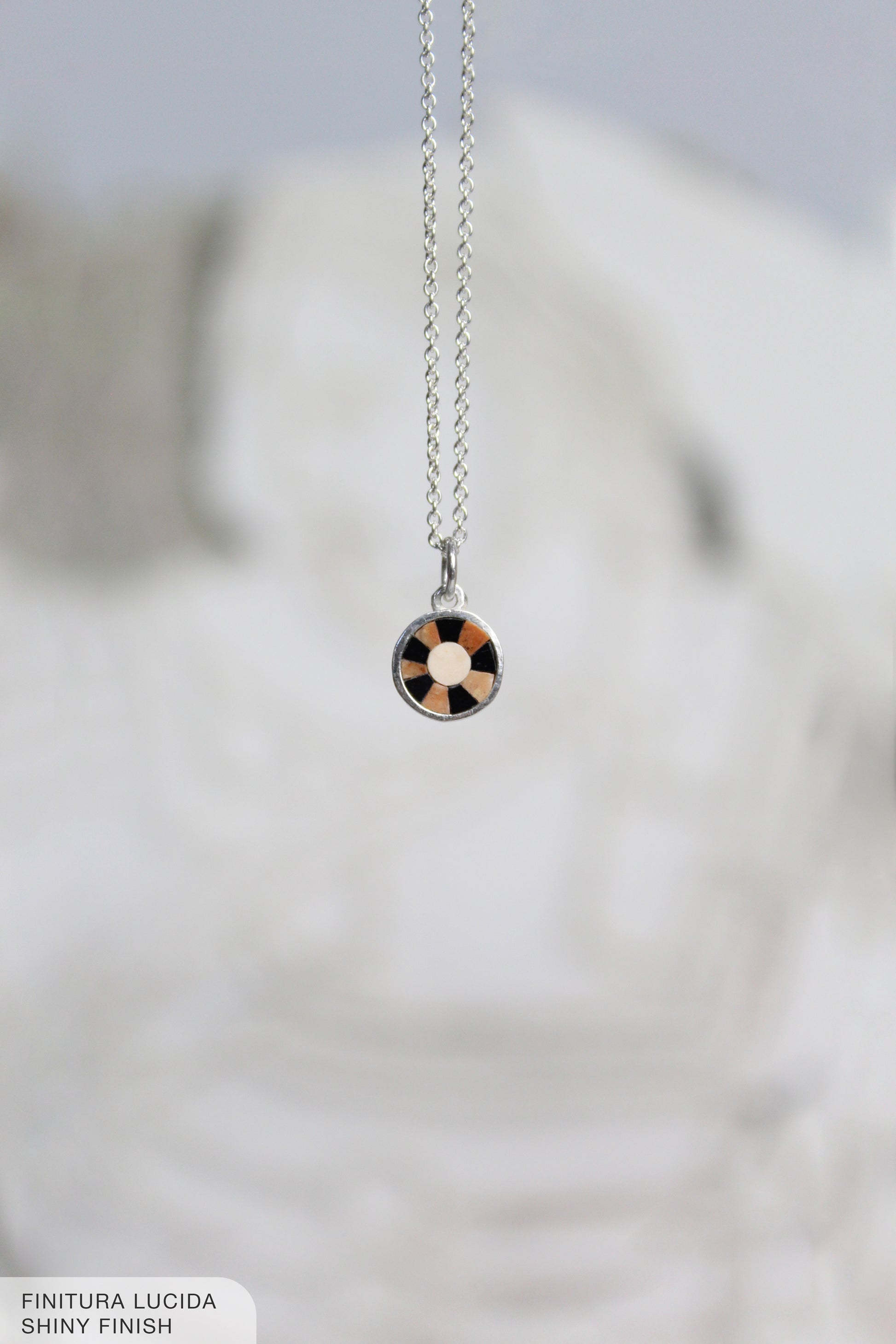 La base del ciondolo è in argento 800 ed è realizzata da una bottega orafa specializzata in gioielli storici.Ogni minima irregolarità di lucidatura o forma è voluta ed è il risultato di una lavorazione manuale.
