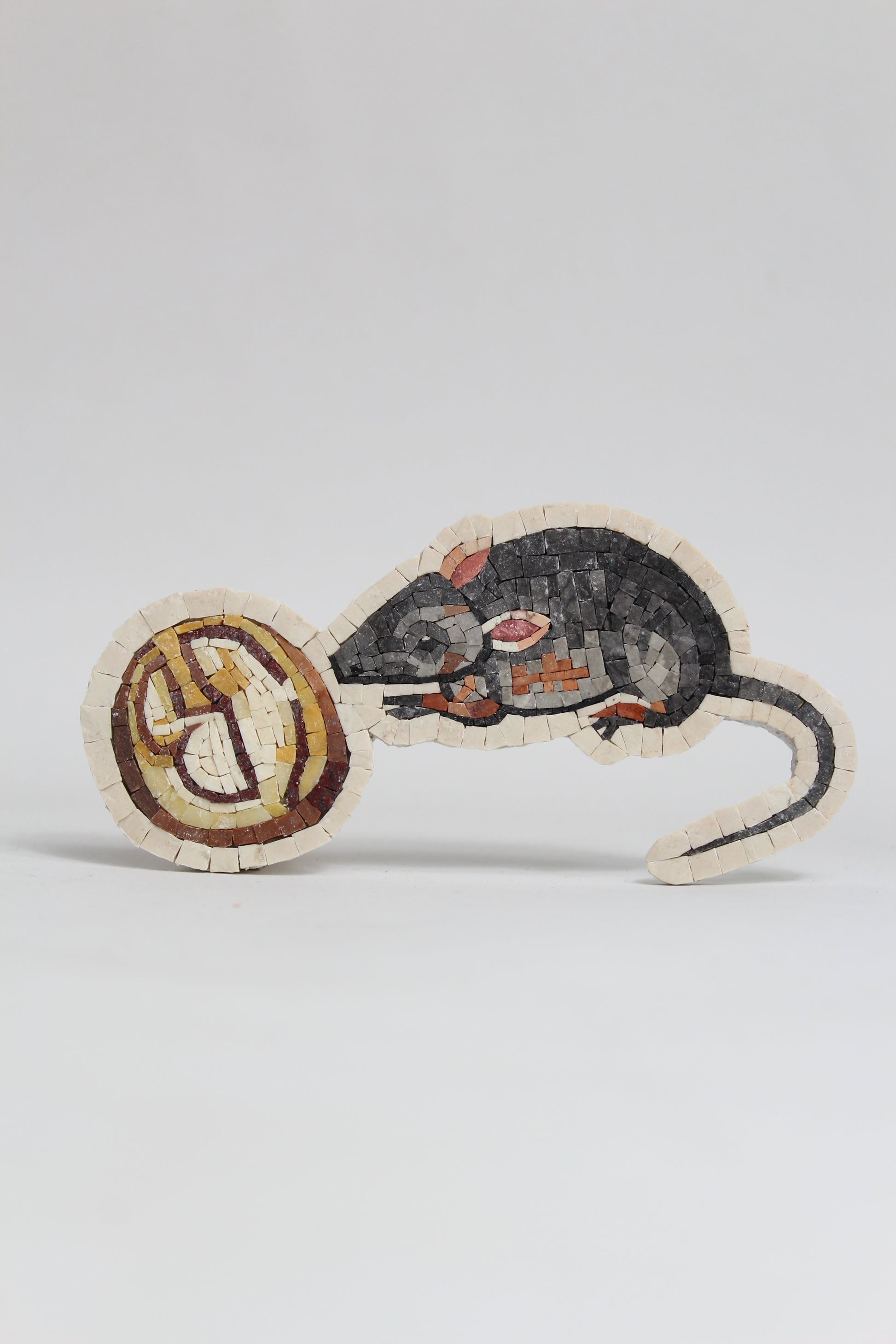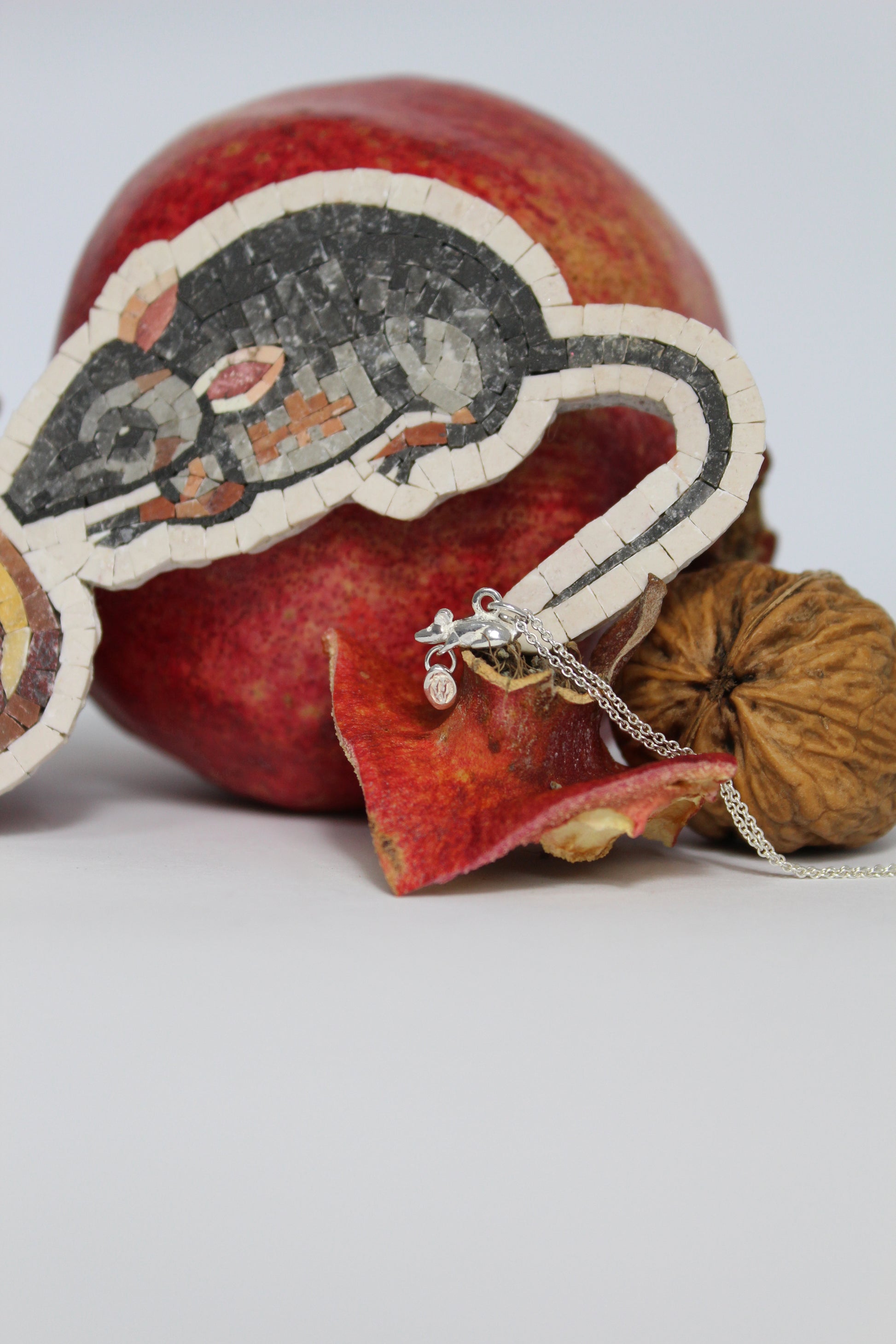 Il ciondolo Topo con Noce nasce dallo studio di un particolare elemento presente in un tipo di mosaico chiamato Asaroton.