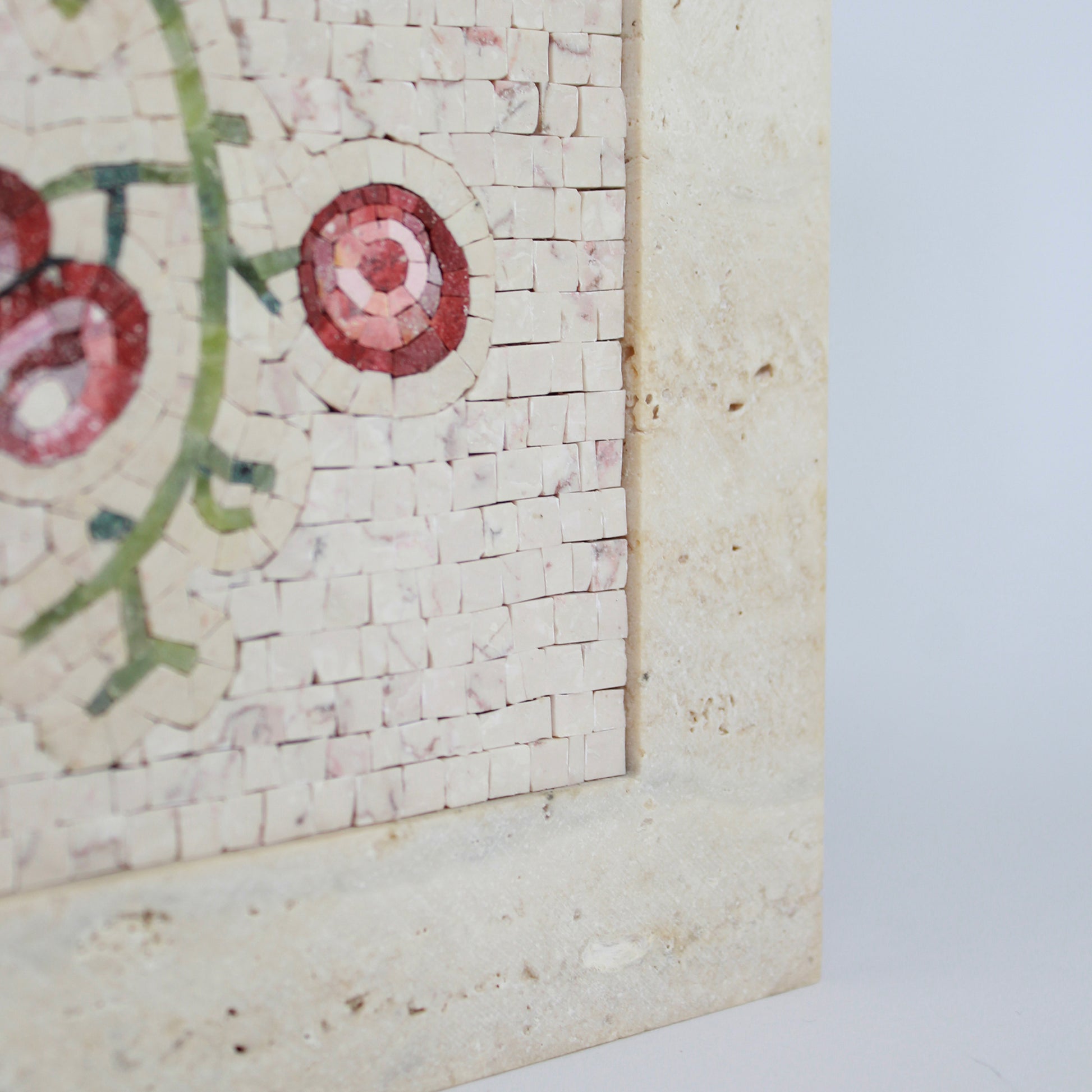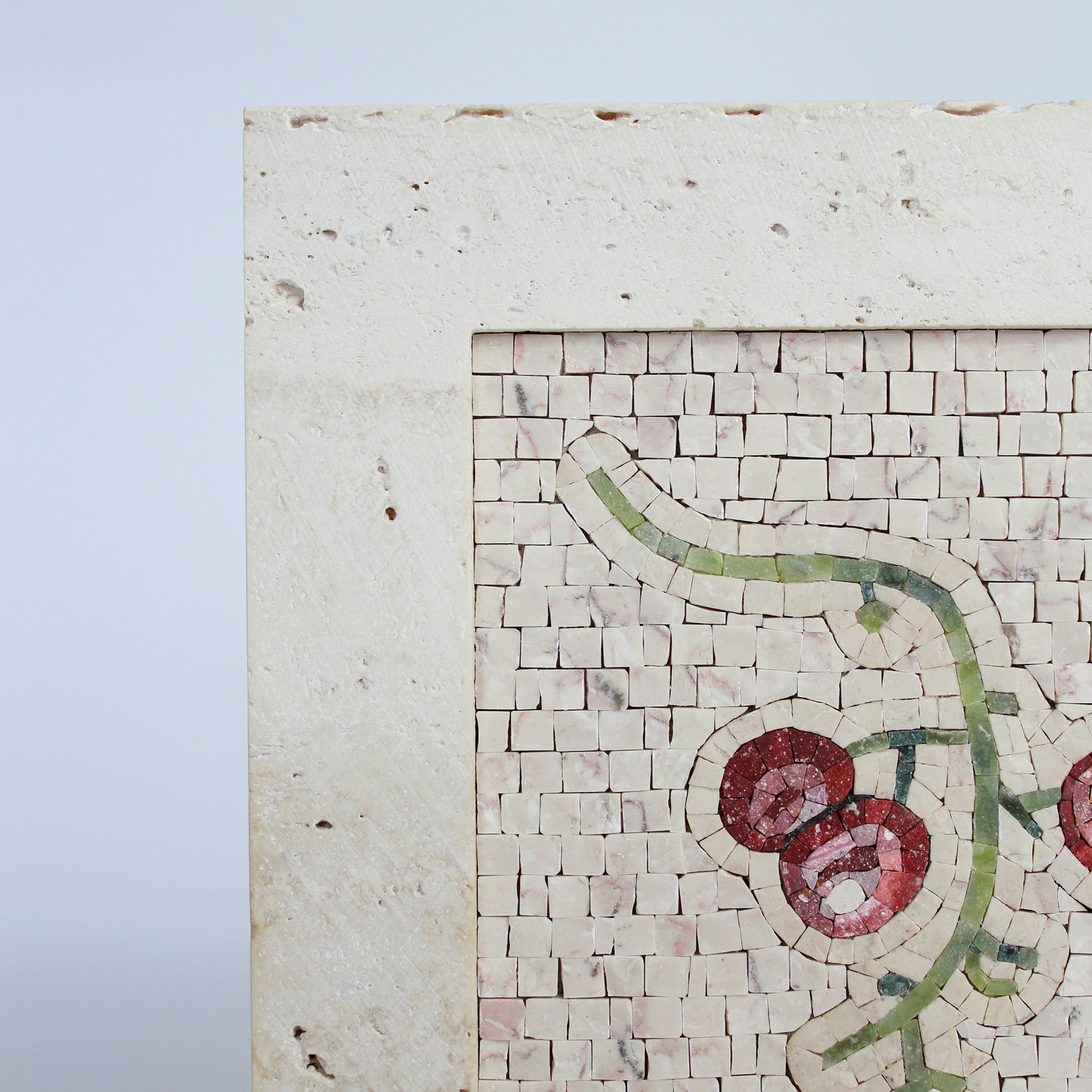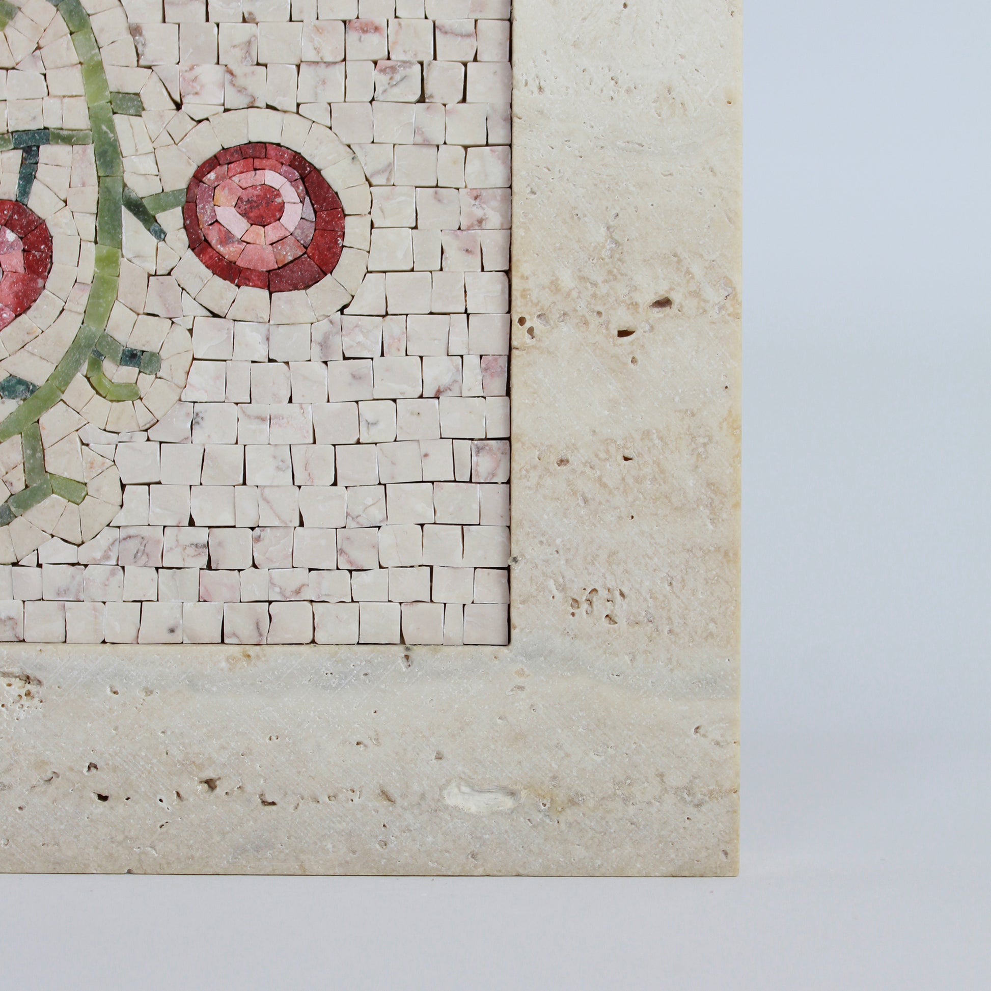 La scelta della Cornice in Marmo in Travertino Classico è studiata per fondersi con lo sfondo in Trani rosato cosicché il torsolo d'uva risalti in tutto il suo splendore.