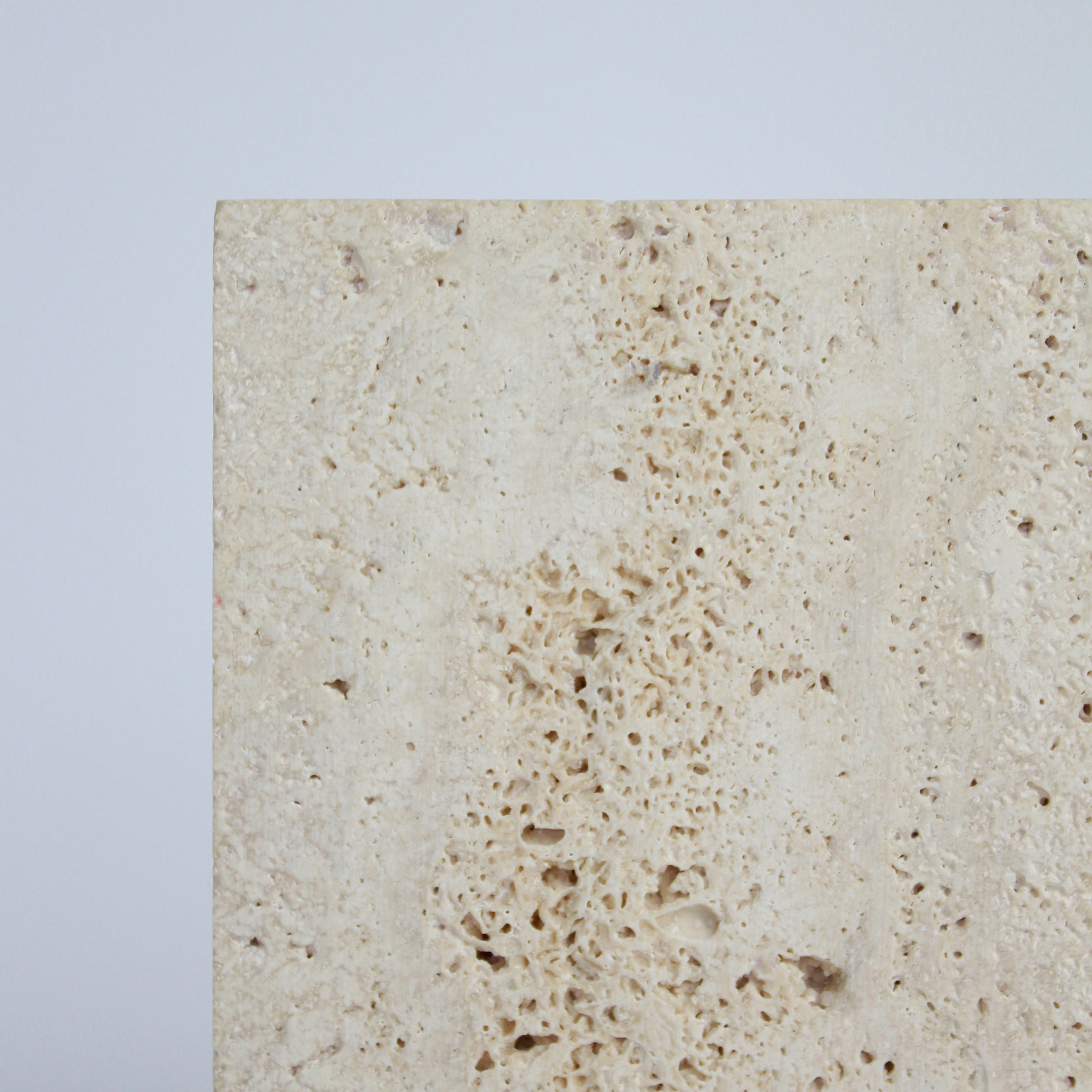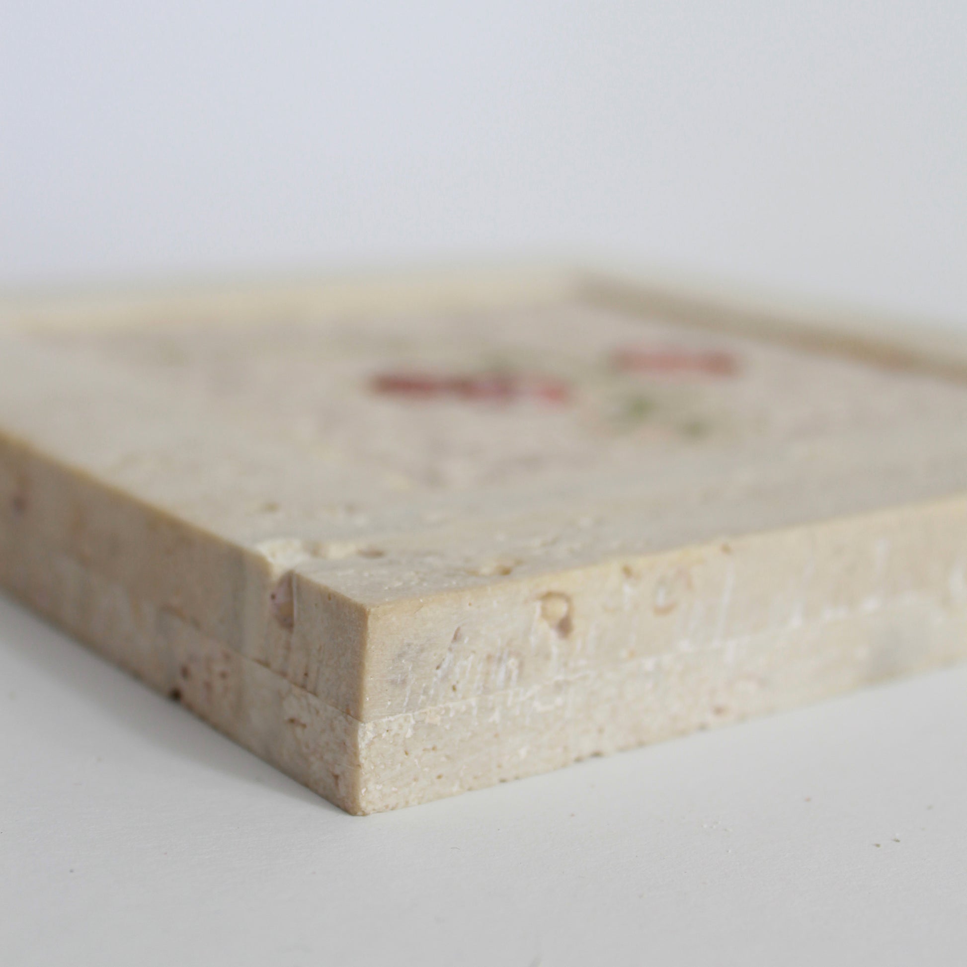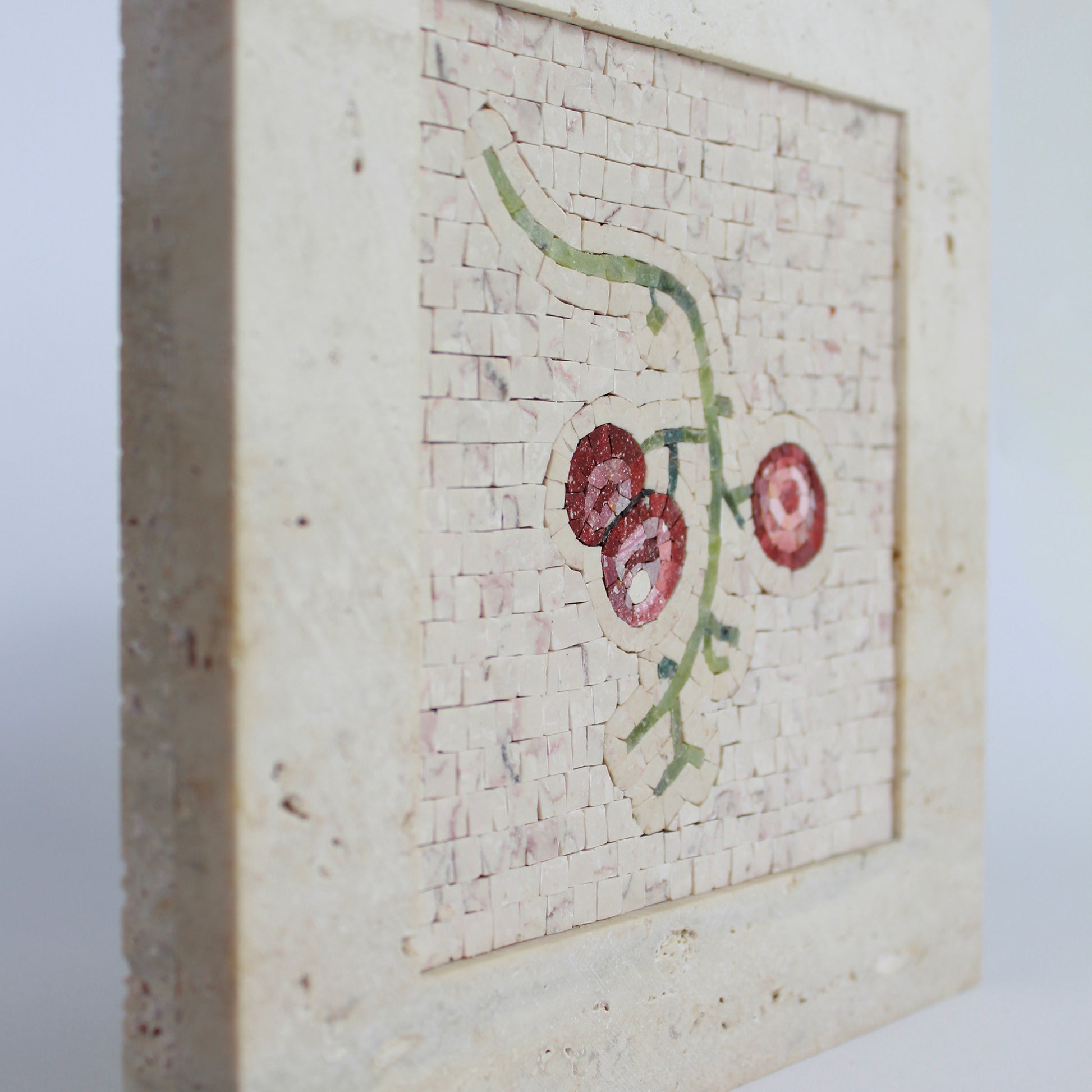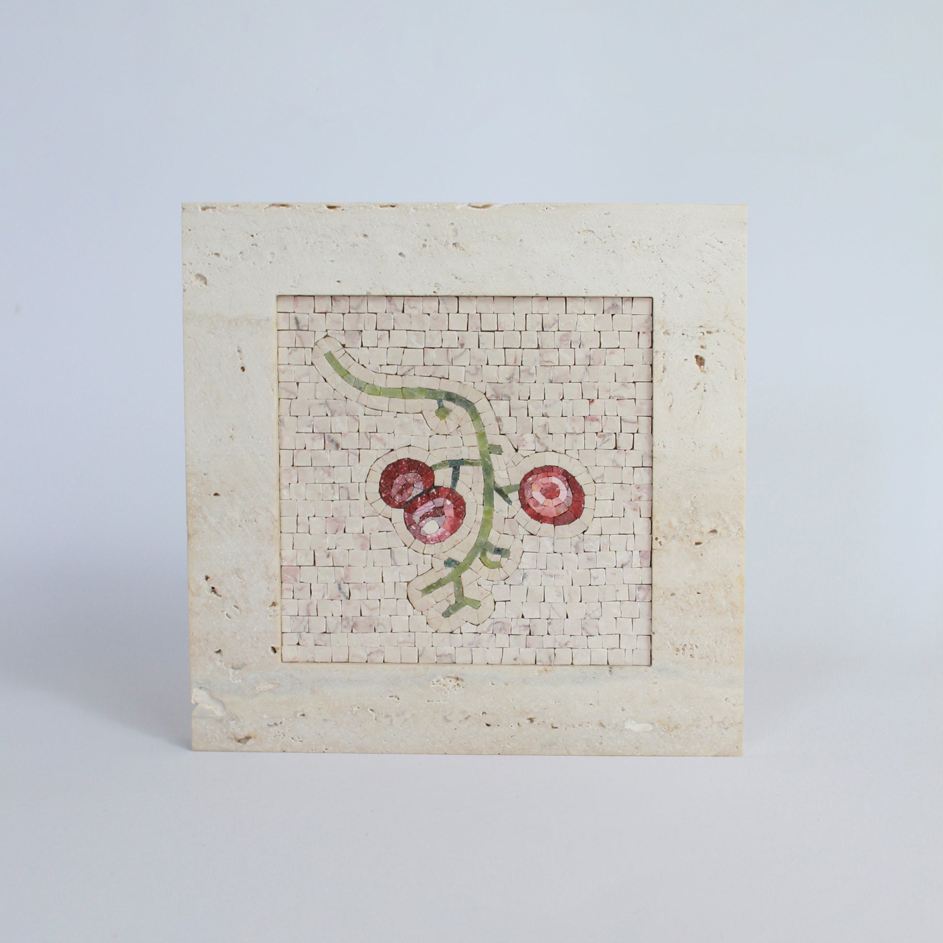 La scelta della Cornice in Marmo in Travertino Classico è studiata per fondersi con lo sfondo in Trani rosato cosicché il torsolo d'uva risalti in tutto il suo splendore.